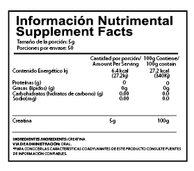 • 100% creatina monohidratada pura, sin sabores, sin rellenos.